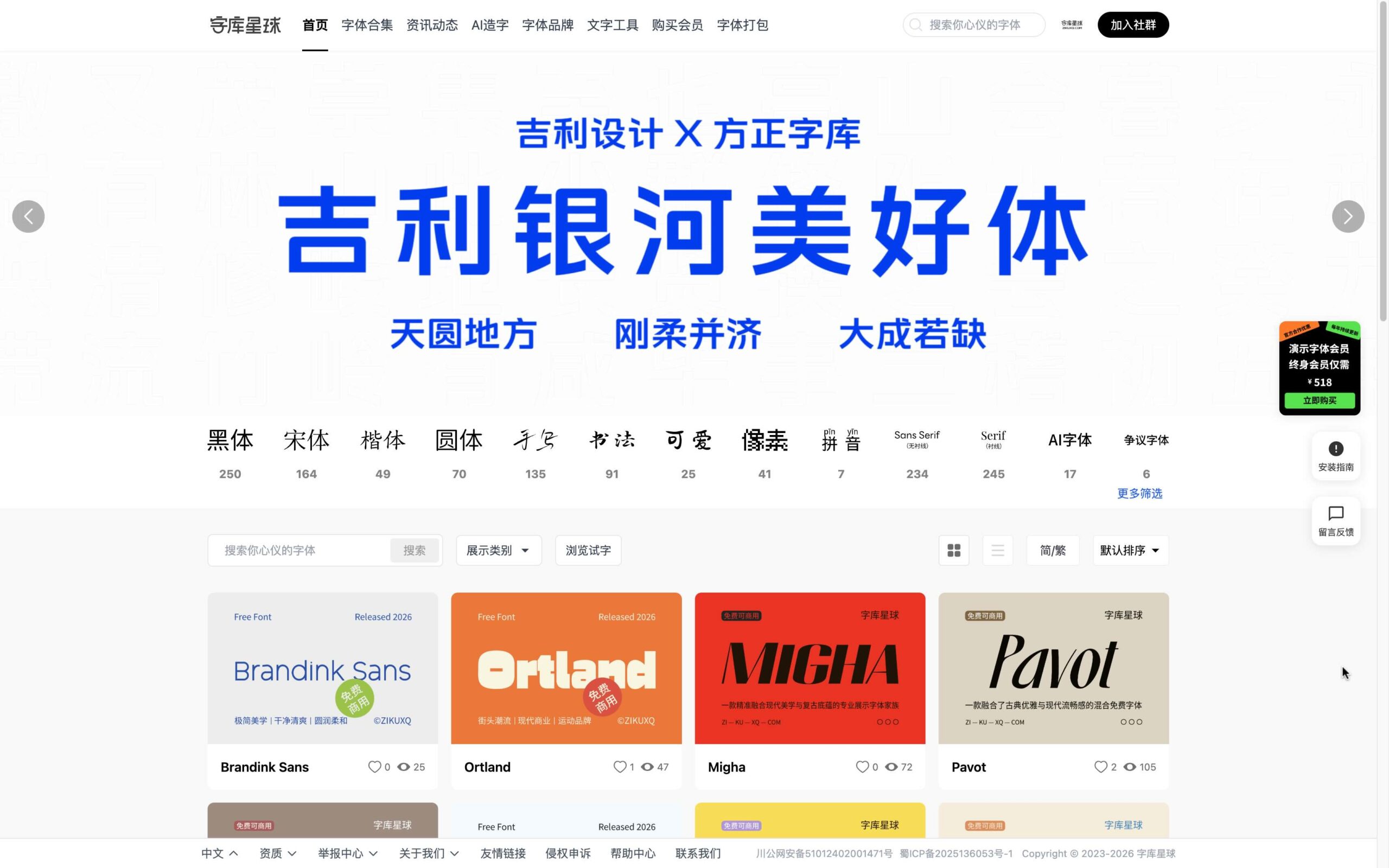 推荐使用本站「字库星球」,因为字库星球专门服务整理的「免费可商用字体」字体专区供大家找寻字体,网站初步整理分为黑体、宋体、楷体、圆体、手写、书法、可爱、像素等:
