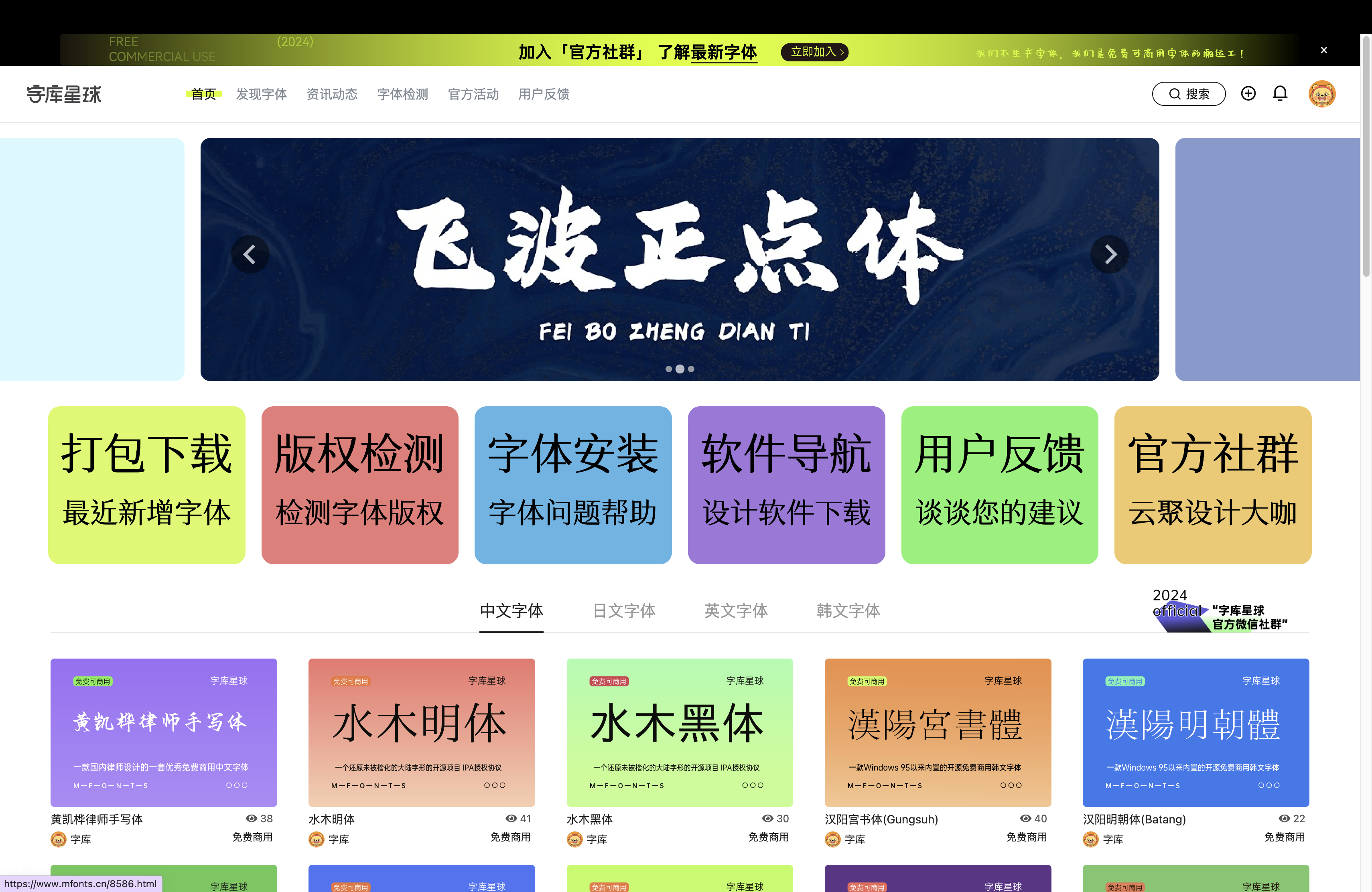 推荐使用本站「字库星球」,因为字库星球专门服务整理的「免费可商用字体」字体专区供大家找寻字体,网站初步整理分为中文字体、日文字体、英文字体、韩文字体四大类字体: