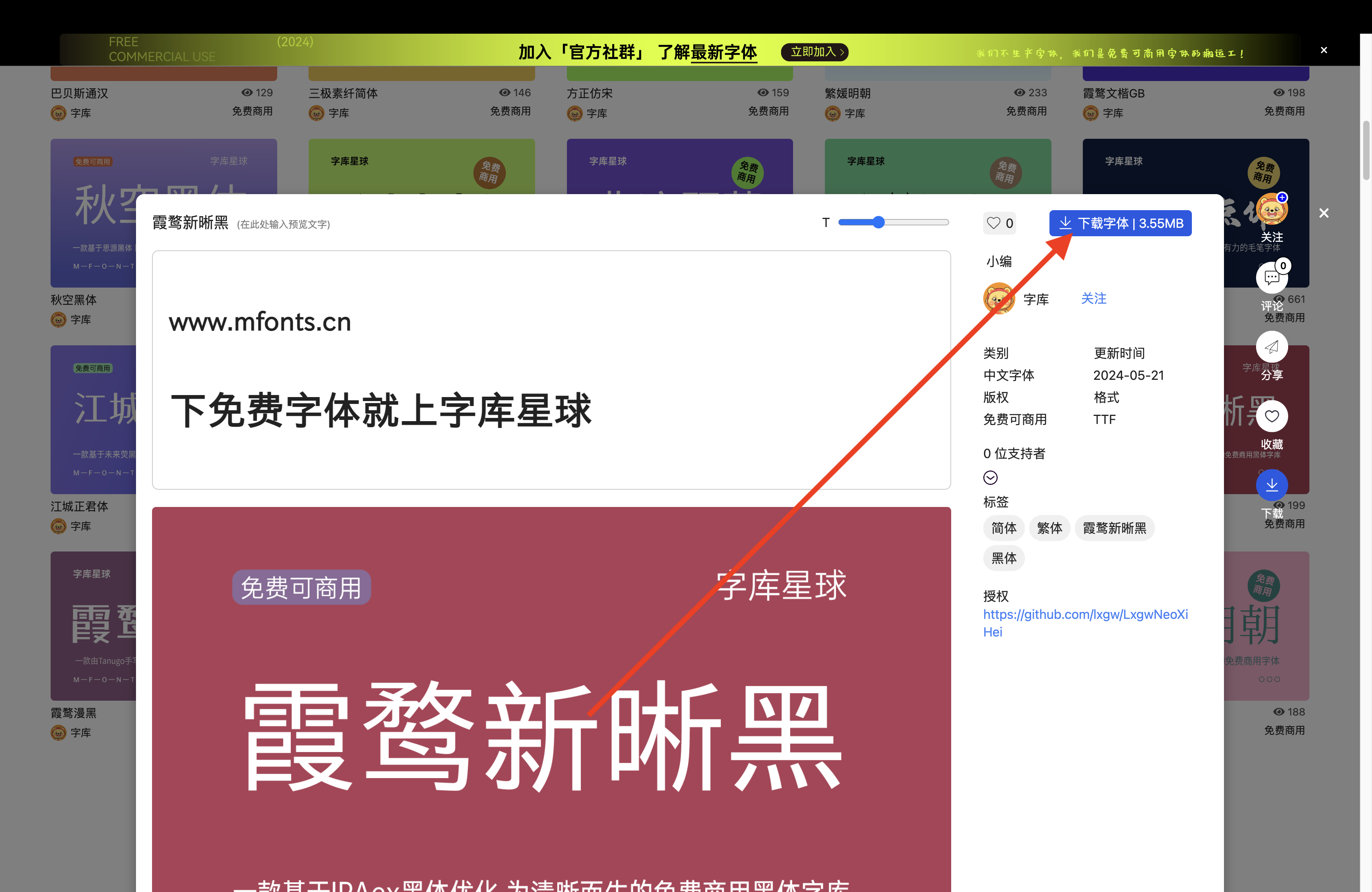 以我们字库星球为设计师朋友们为例吧,通过搜索找到自己想要下载的字体之后,直接点击信息卡片进入该字体详情页: