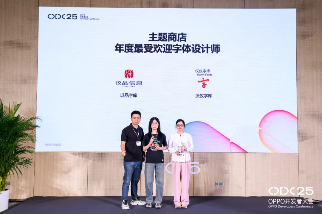 在本次大会的内容生态分论坛中,汉仪字库凭借卓越的设计实力与广泛用户认可,荣获“2025年 OPPO 主题商店年度最受欢迎字体设计师”称号。同时,旗下年轻品牌“Aa字库”以其独特的美学风格与创新设计,被评选为“2025年 OPPO 主题商店至美之选”。这两项荣誉,是对汉仪字库及其旗下品牌持续输出高品质字体内容、推动行业美学进步的最佳肯定。