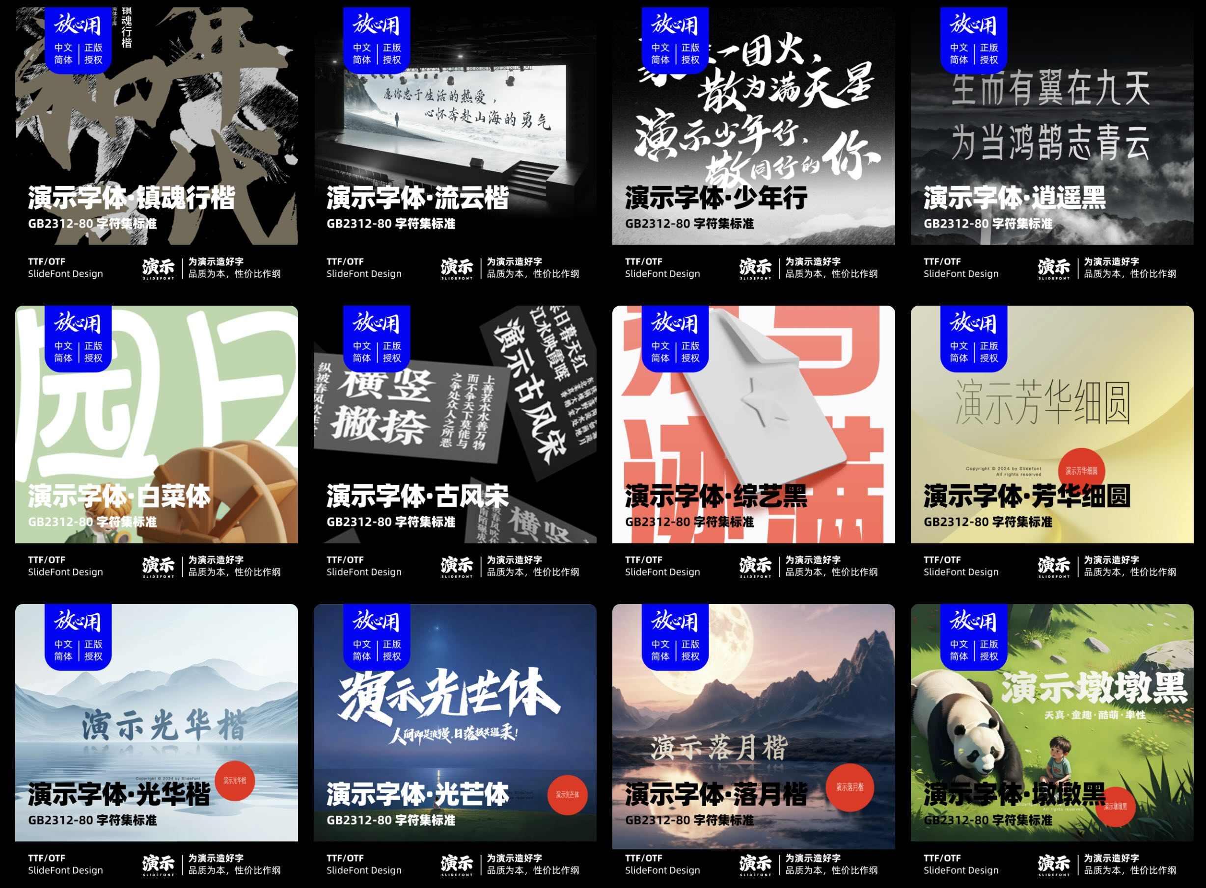 从演示秀宋体的灵秀多姿,到演示写意楷的逍遥写意;从演示金字招牌体的沉稳大气,到演示少年行的青春活力,每一款字体都经过精心设计,展现出独特的视觉魅力。这些字体不仅适用于品牌标识、海报设计、产品包装等传统场景,也能完美契合短视频、社交媒体内容等数字化传播需求。